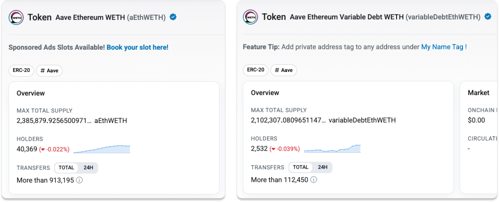 On Etherscan, Aave lending activities appear as aTokens (representing supplied assets) and debt tokens (representing borrowed assets). For example, Aave ETH reserves show around $7.92B supplied and $6.98B borrowed, all verifiable onchain.
