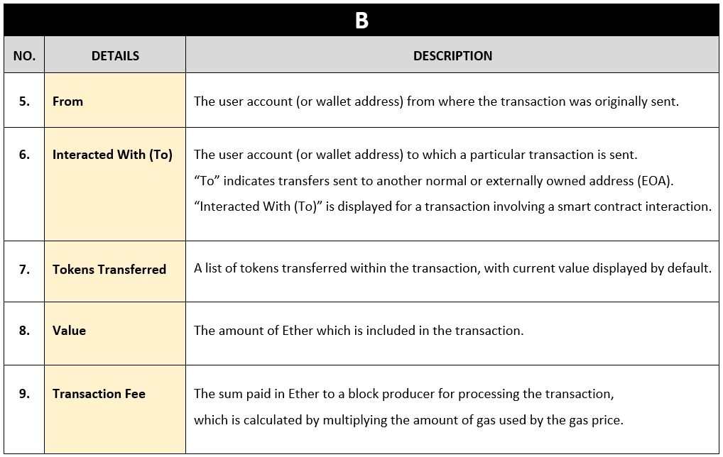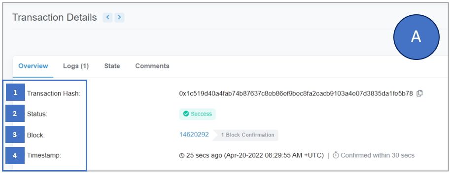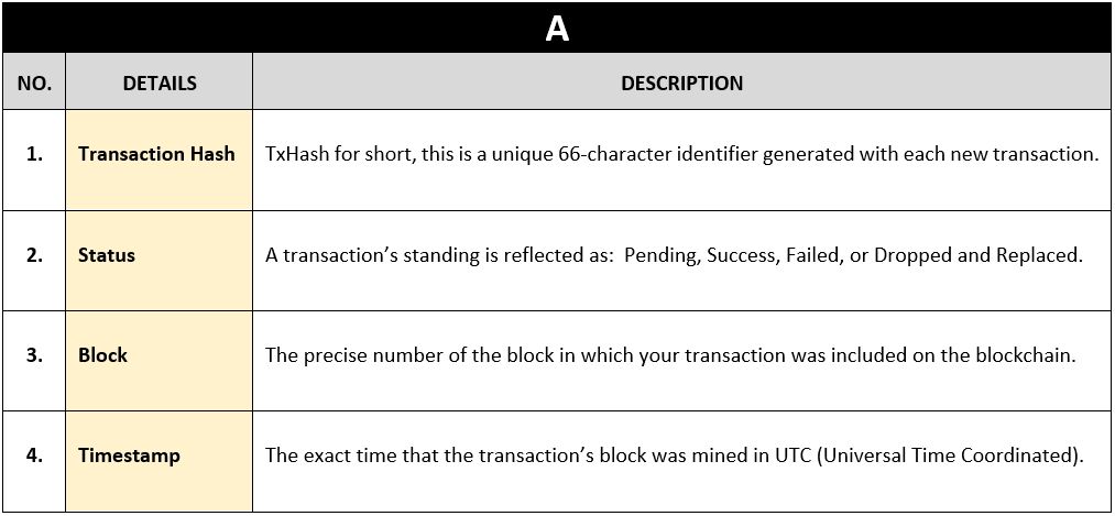 The details of a transaction are an important element to help track your movements on the blockchain. The Transaction Details page is readily available and easily accessible through Etherscan at any time. This page is widely used as a receipt between two transacting parties.