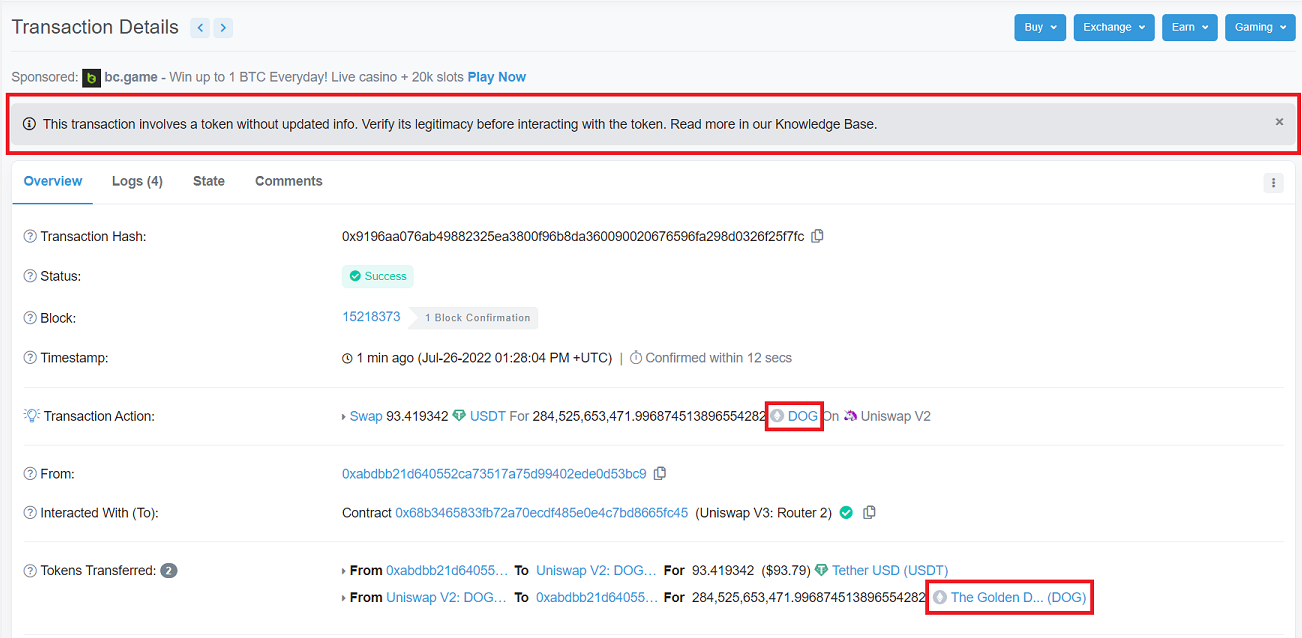 On top of the Transaction Details page, from time to time, users will see a public note informing them that the transaction involves a non-updated token. This is created to remind everyone to stay alert and make sure they are interacting with the correct token at all times. If you are a user and you come across this, there is no need to worry. All you have to do is verify that you are interacting with the right token.