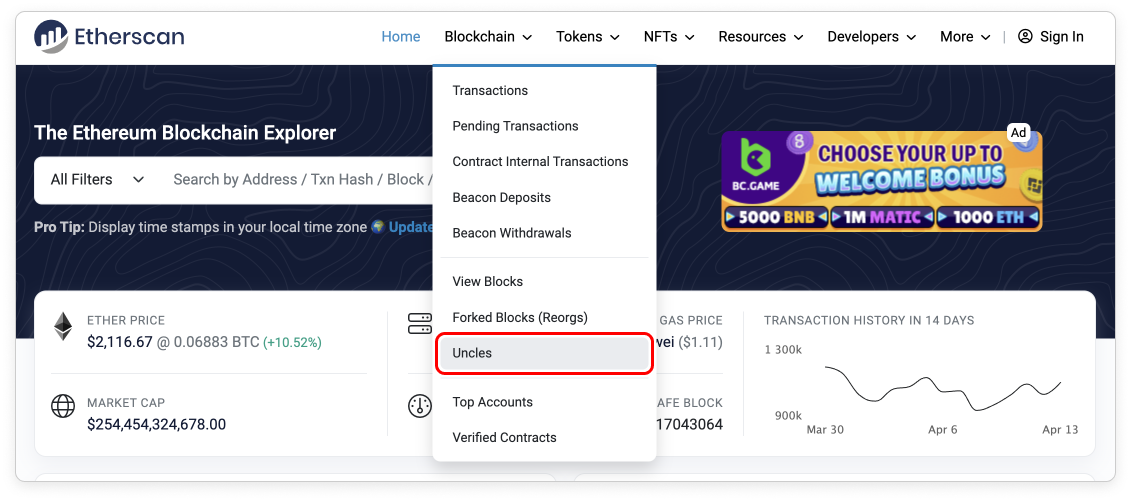 Please note that the uncle block page is only active and available before The Merge. Uncle blocks are no longer produced after The Merge, and this page only serves as historical reference purposes.