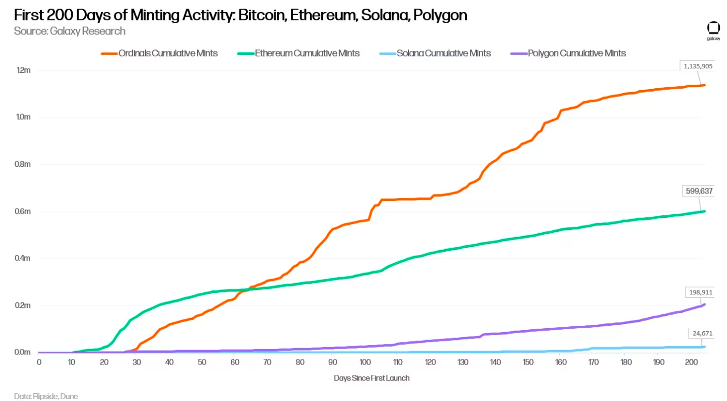 According to Galaxy Research, the first 200 days of image-based Ordinals Inscriptions have shown more activity compared to NFT mints on Ethereum, Solana, and Polygon during their respective early days.