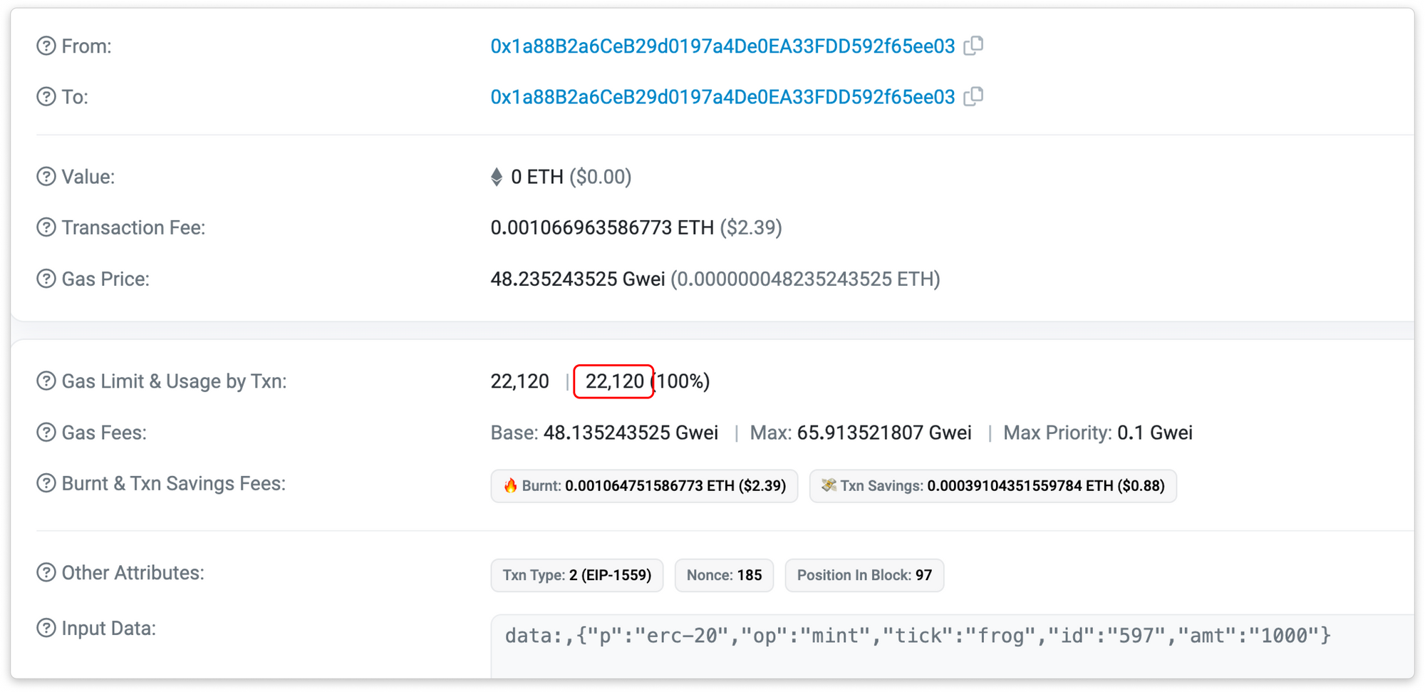 The screenshot below illustrates an example of minting BRC-20 type tokens on Ethereum: