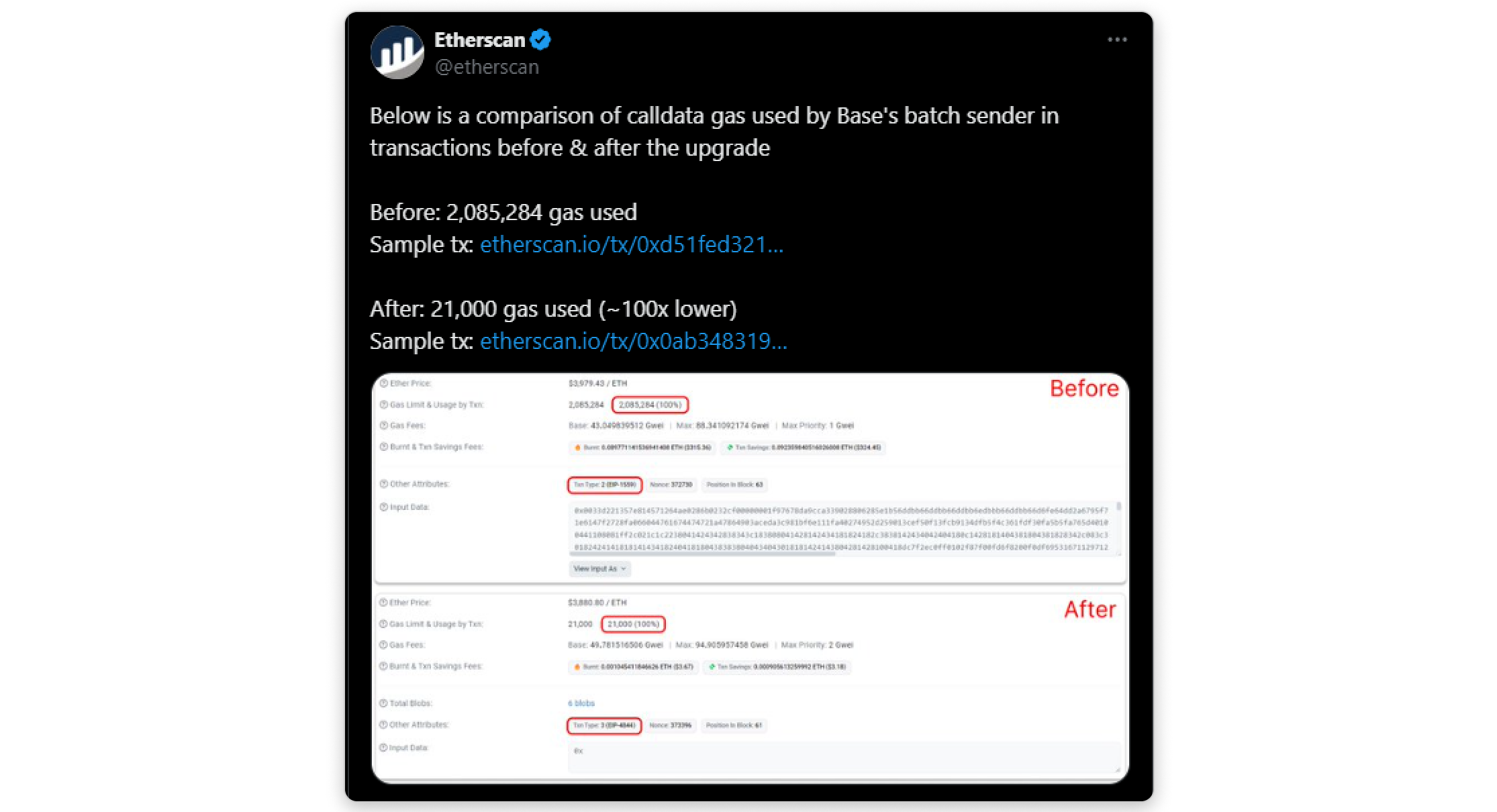 Rollups that are posting batched data to blobs see an immediate transaction fee reduction on Ethereum.
