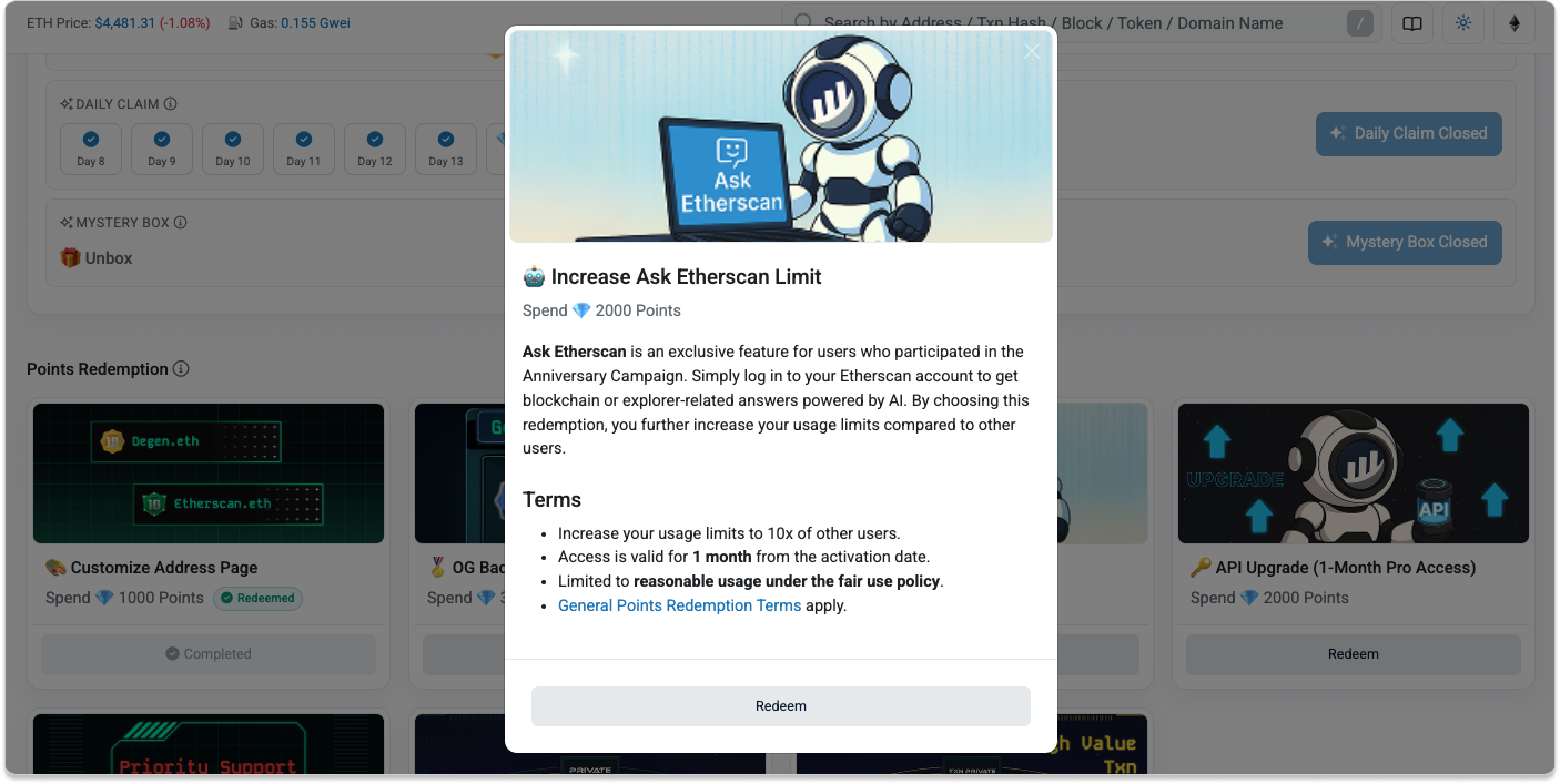By default, Ask Etherscan comes with limited usage. To unlock more, you can redeem with 2000 Points.
