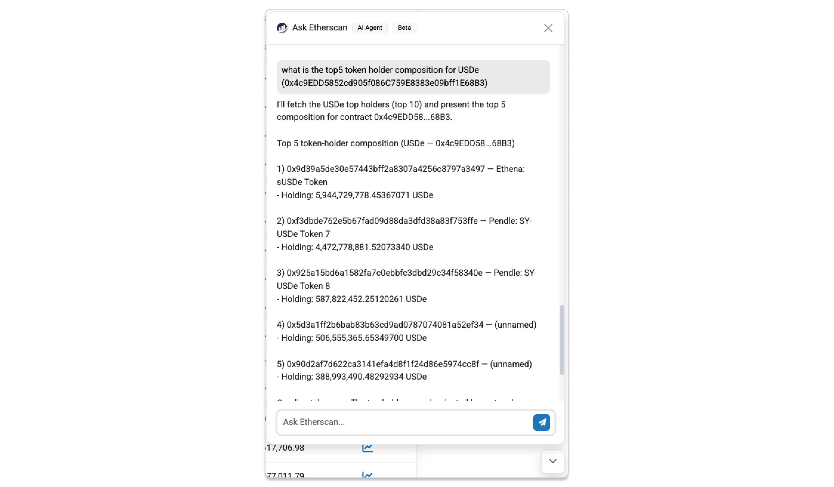 Ask Etherscan is an AI-powered assistant built into Etherscan that makes blockchain data easier to understand. Instead of analyzing raw transactions or token transfers on your own, you can simply ask a question and get a clear, structured answer.