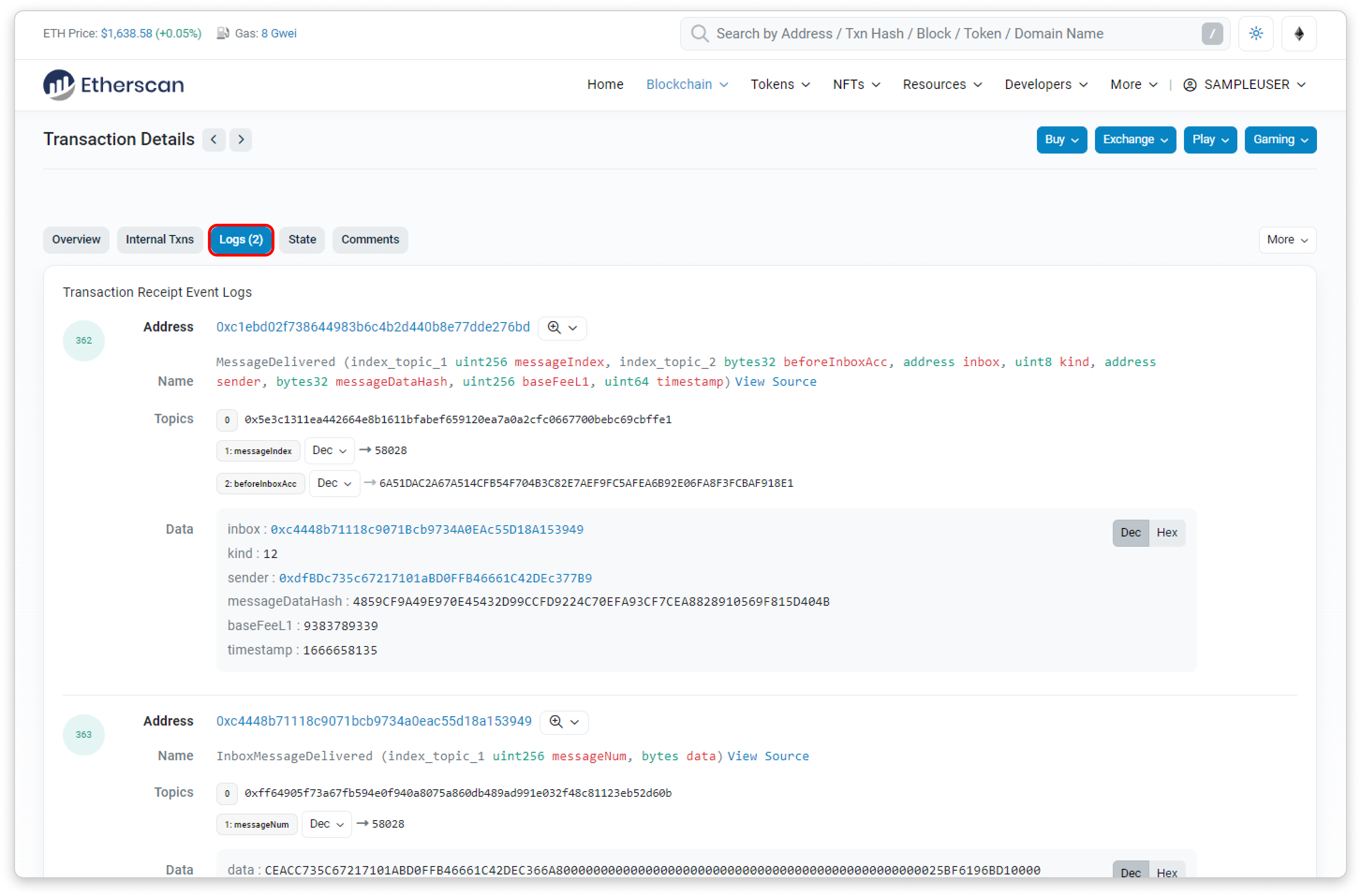 Access the Event Logs by going to the transaction details page, and select the Logs tab:
