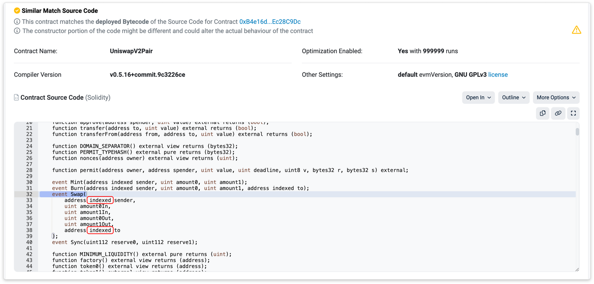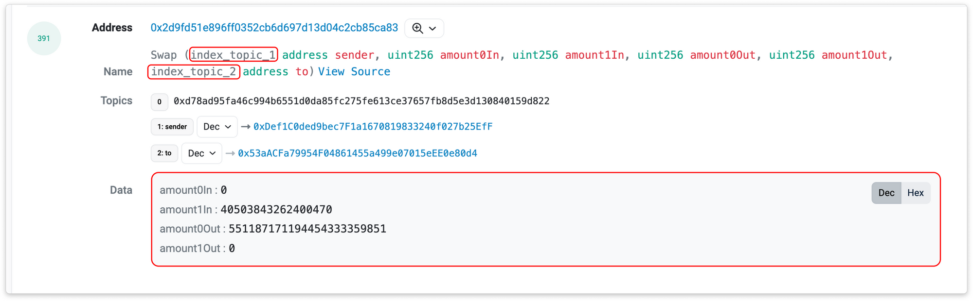 Any parameters that are not marked as indexed will be included in the event log's data section. In the example above, amount0In, amount1In, amount0out, amount1out, are not marked as indexed, so they will be part of the event log's data.