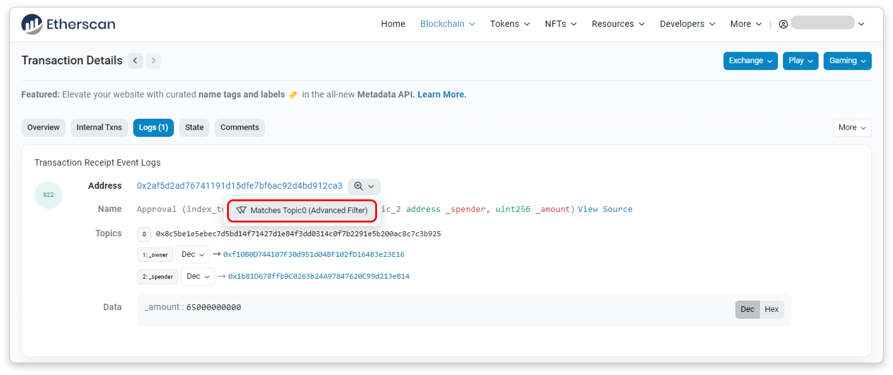 Visit the Logs tab on the Transaction Details page, click the magnifying glass icon to filter for a specific contract event, and use additional filter fields to refine your search.