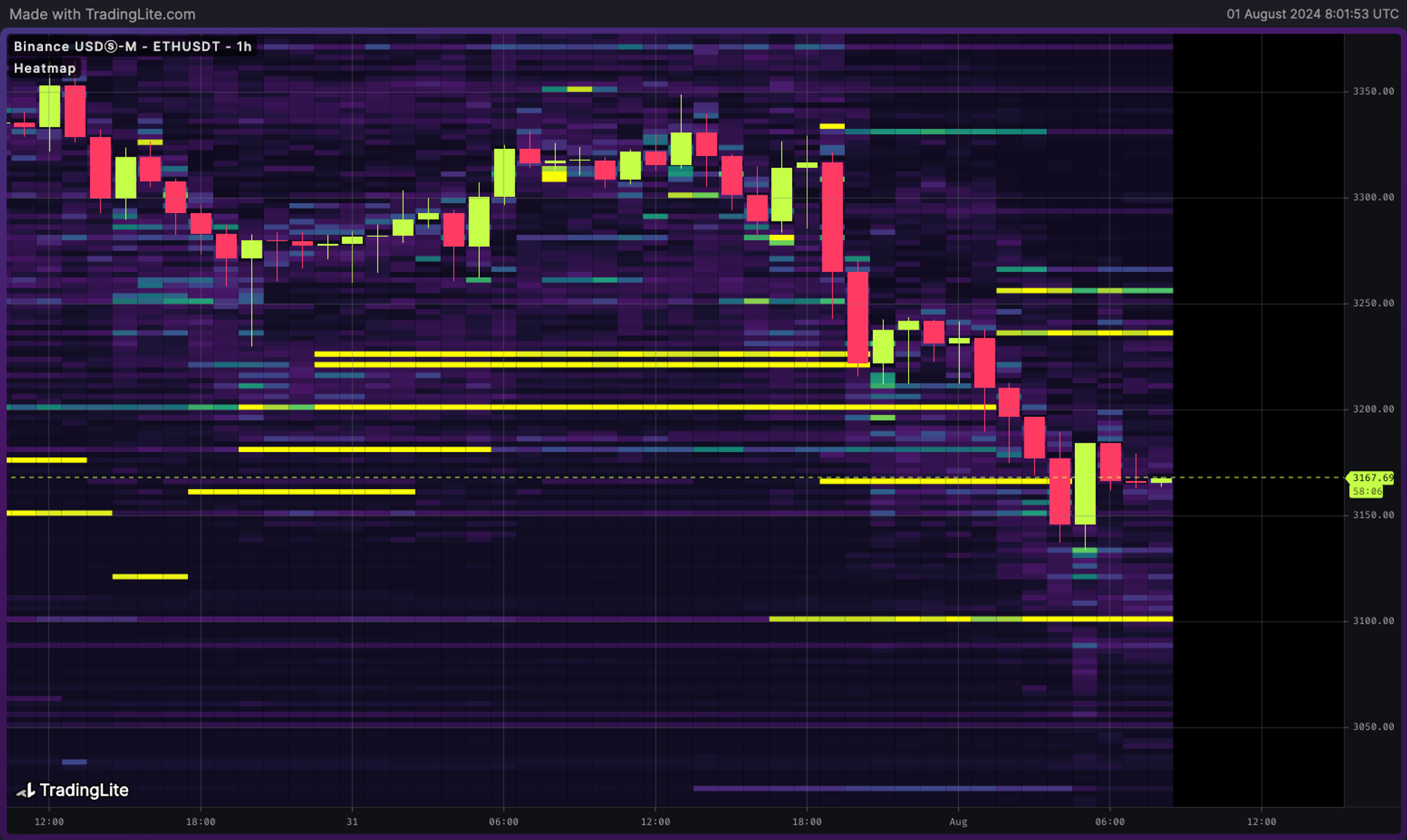 The brighter the color, the higher the concentration of orders. In the example below, we can see that for the ETH-USDT pair on Binance Futures, the next major level of support is at $3,100 while the next major level of resistance is at $3,235, represented by the brightest yellow cells.