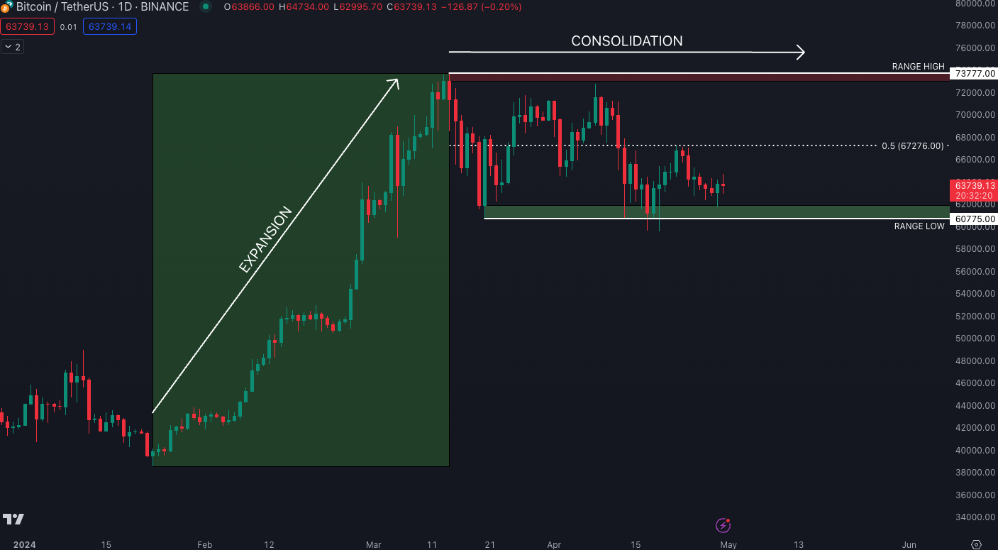 A range is defined as a period of consolidation after a period of expansion. We can identify the range high as the top of the expansion, with the range low being the bottom of the pullback. We may also mark out demand (green) and supply (red) areas using the wicks on the range forming candles.